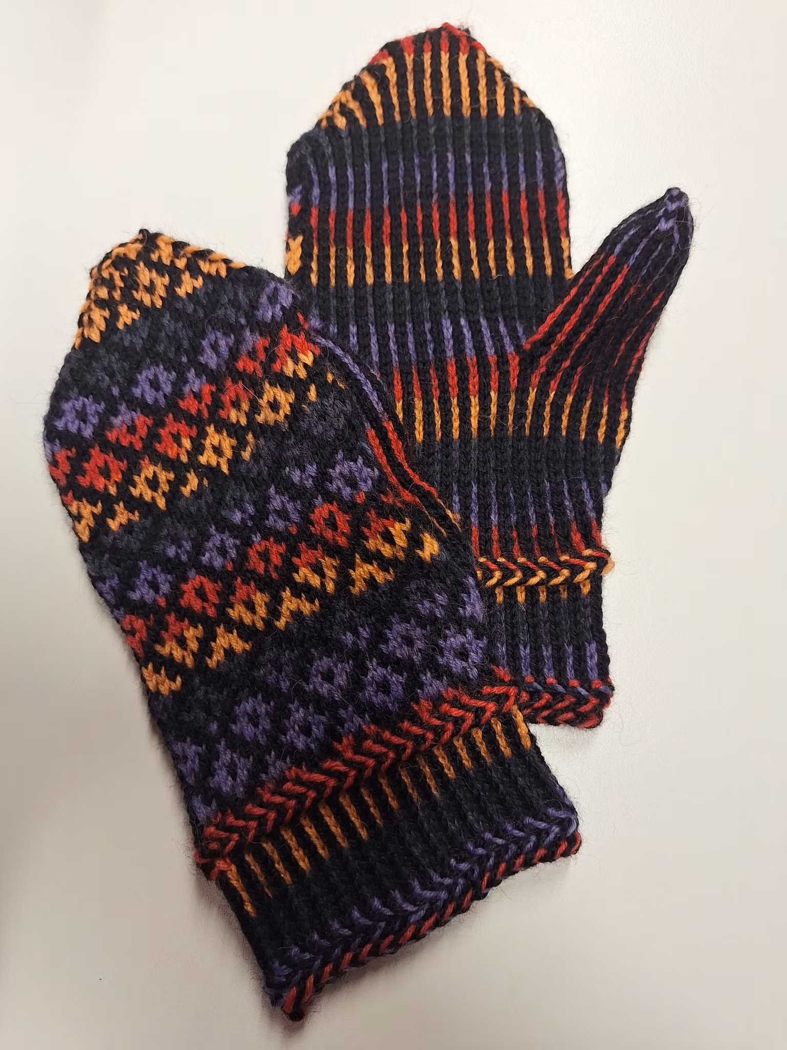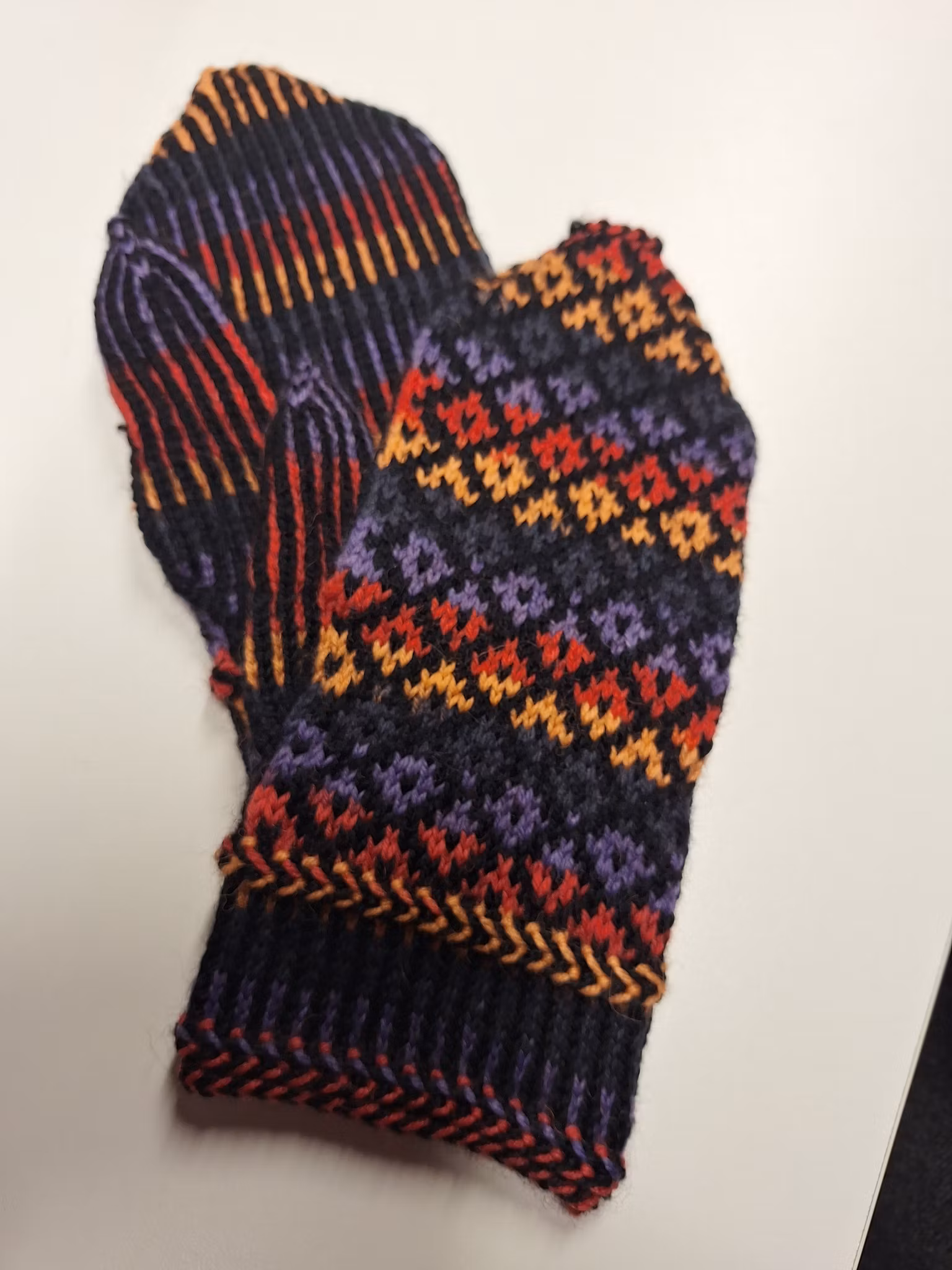 Mönsterstickade vantar. Valkade, stickade med dubbelt garn. Kantad med vackra estniska flätor.