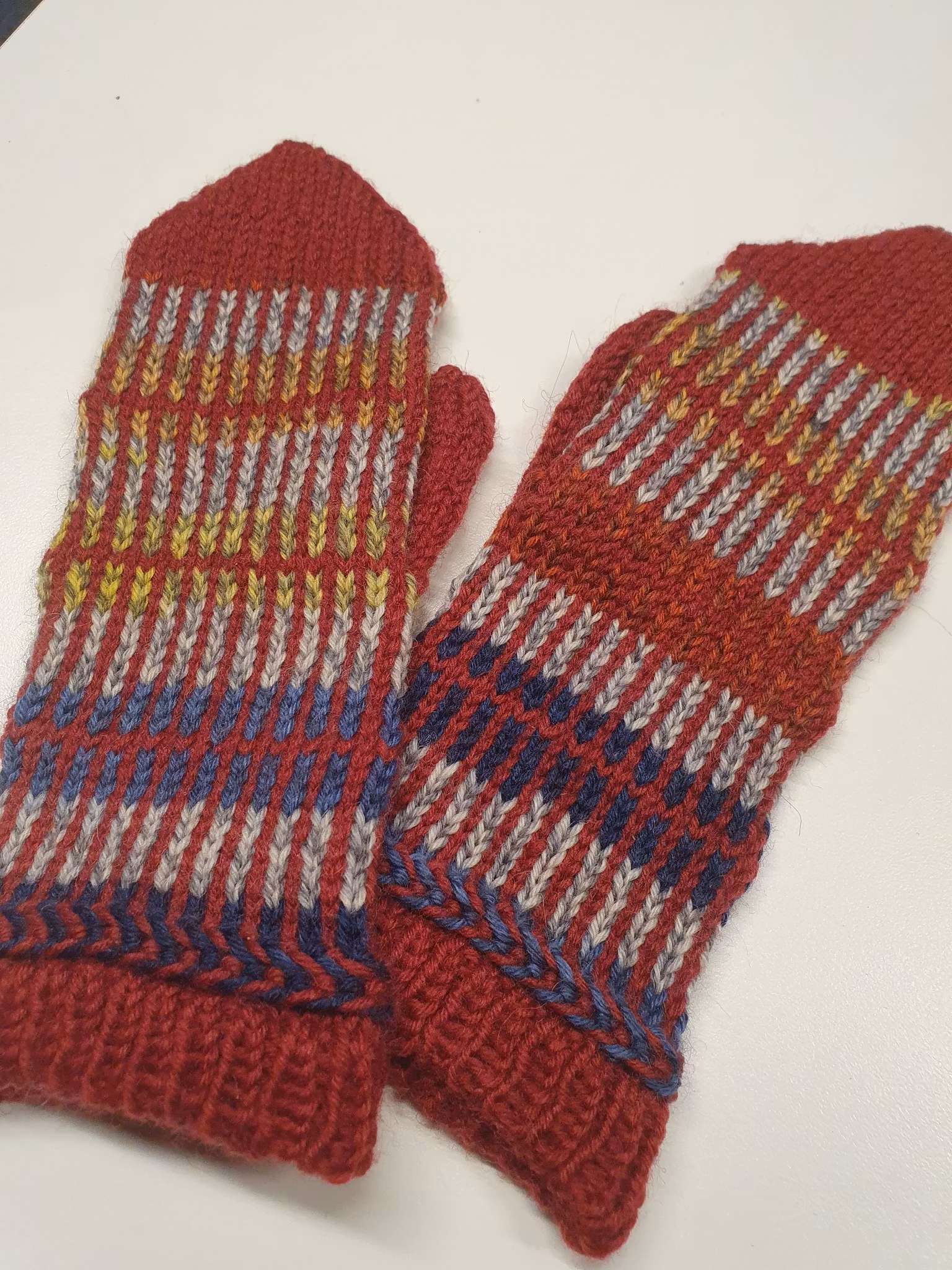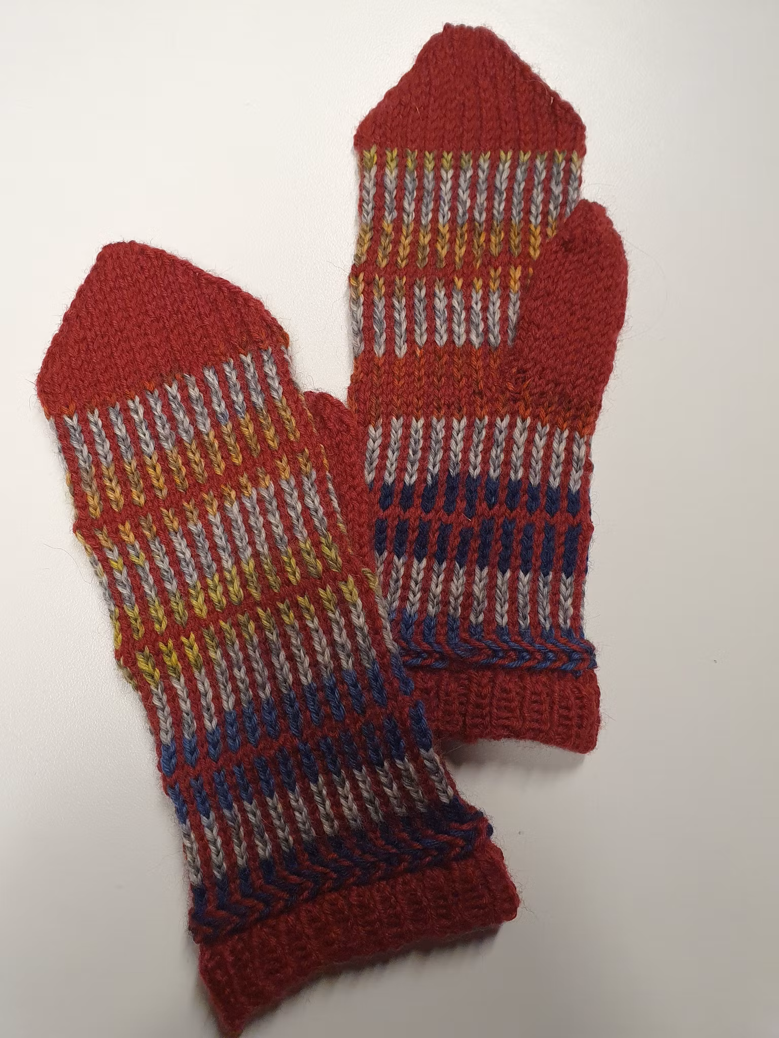 Mönsterstickade vantar. Valkade, stickade med dubbelt garn. Kantad med vackra estniska flätor.