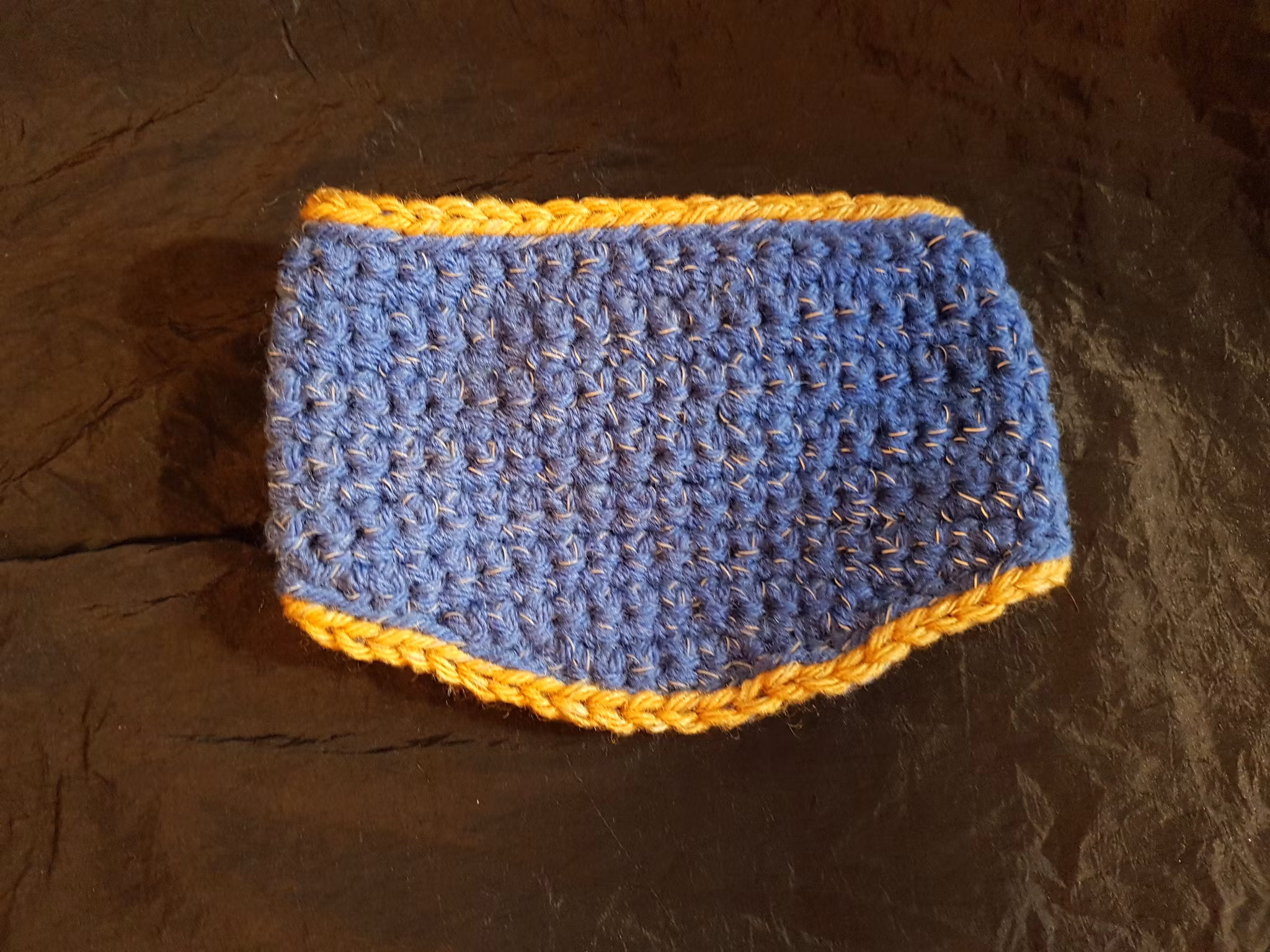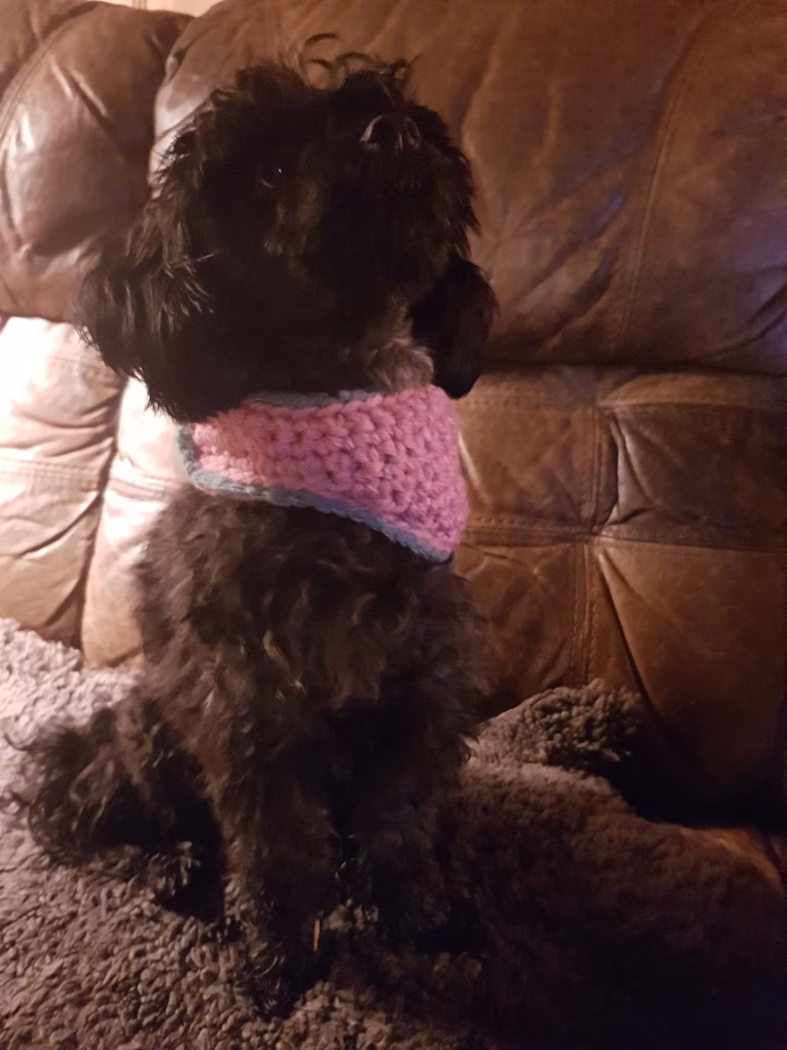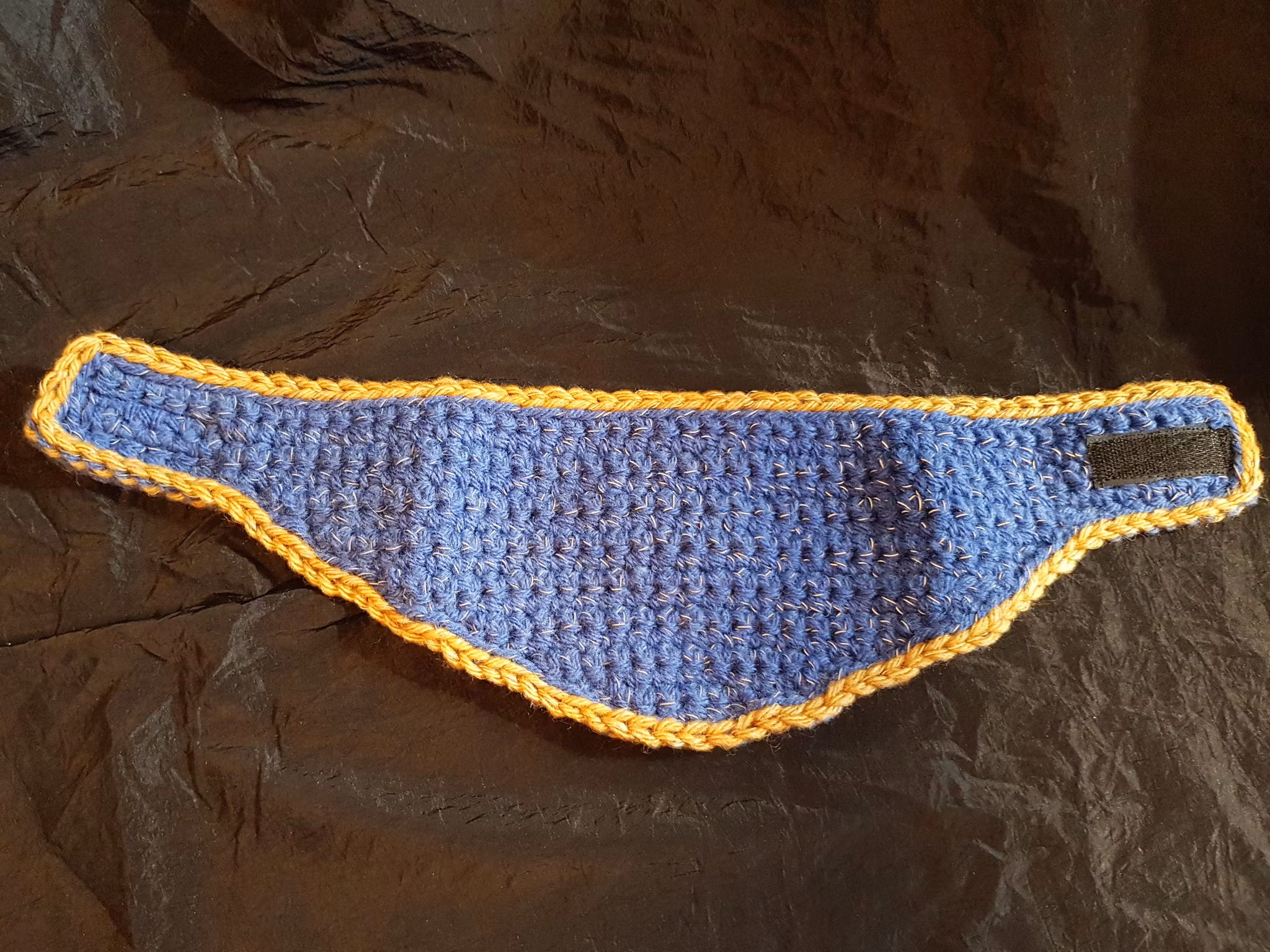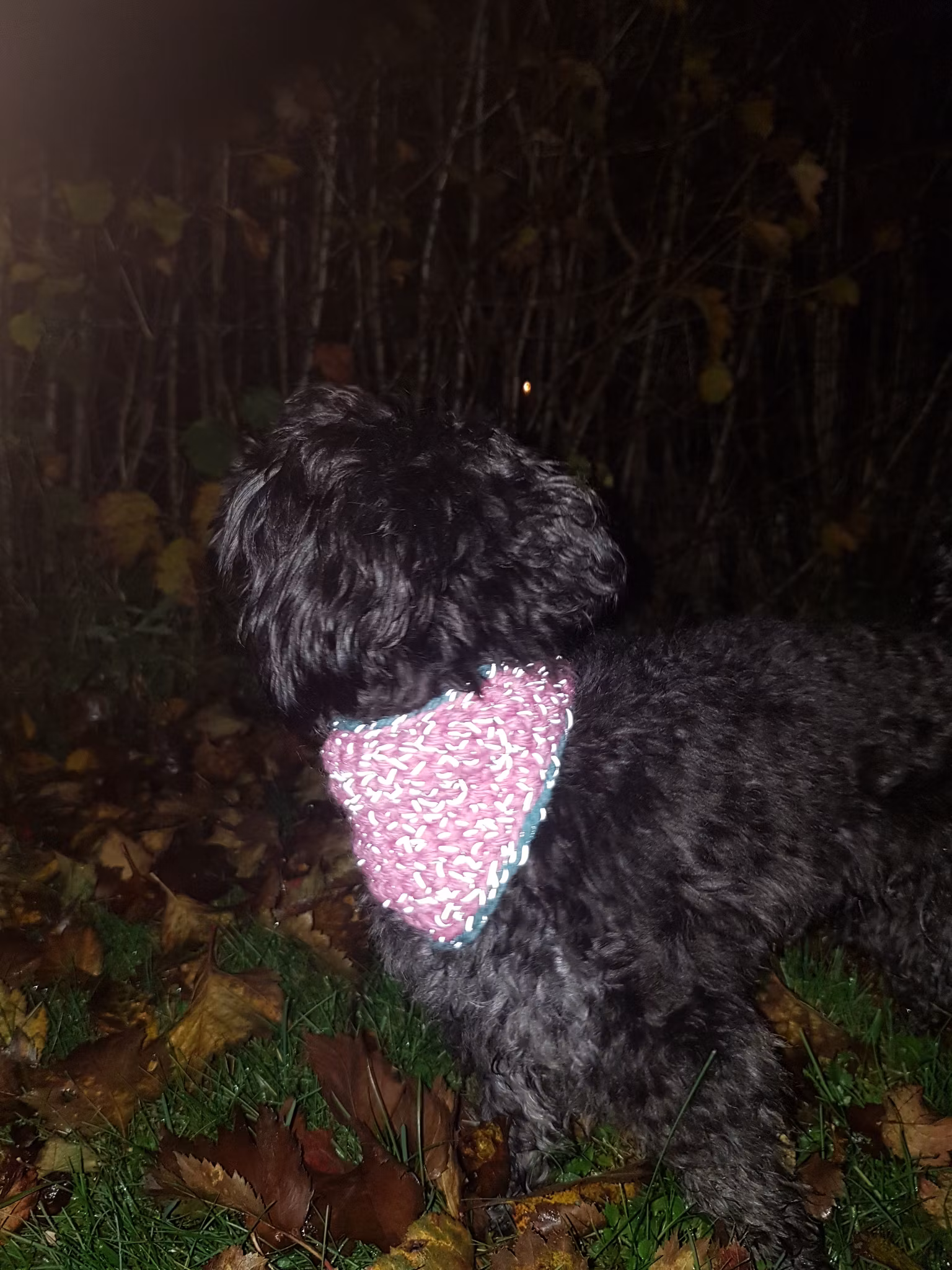 Halsduk till hunden, av reflekterande garn. Reflekterar ljus från t.ex. billysen.