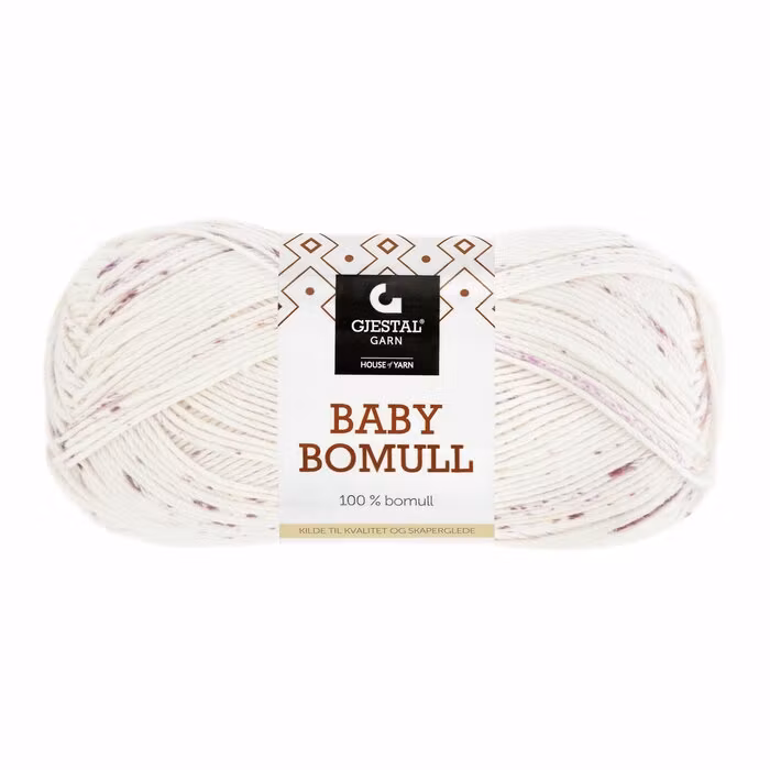 Baby bomull från Gjestal Garn är ett 100% rent bomullsgarn. Det är en mycket mjuk garn och passar därför bra till alla typer av babykläder och filtar, och det är även ett utmärkt val inom stickat för vuxna med känslig hud.