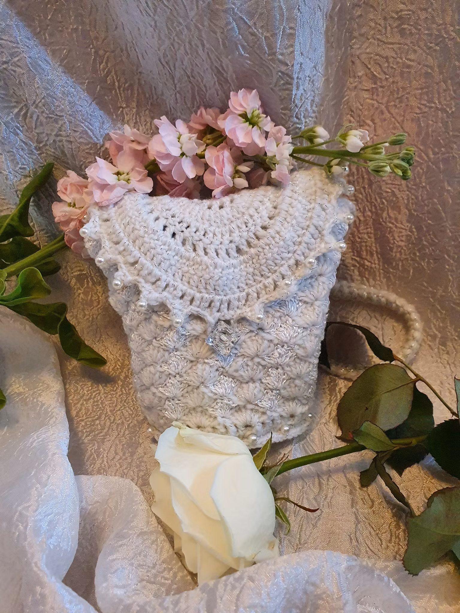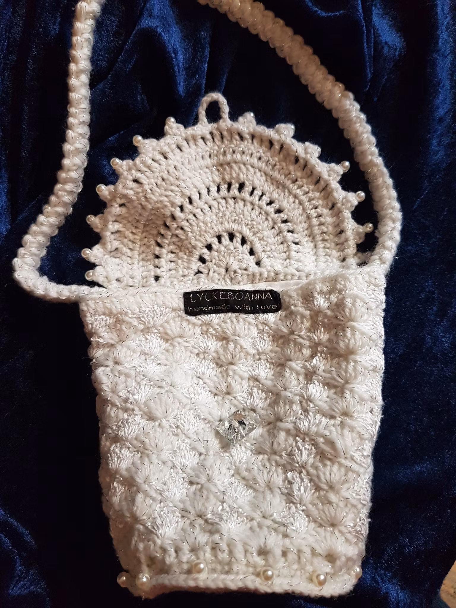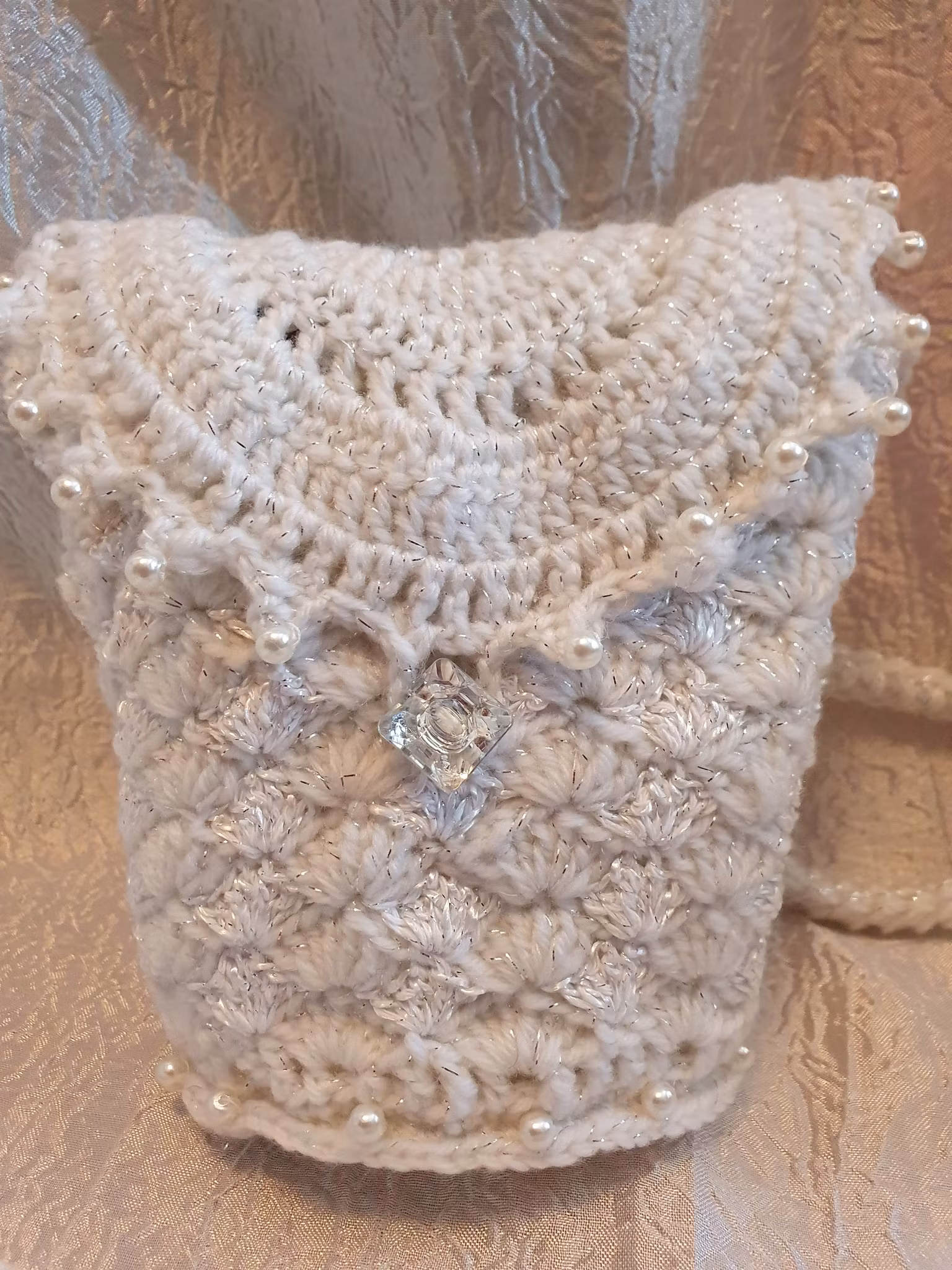 handvirkad av två effektgarn med olika struktur och glans. fodrad med vit satin. Kantad med 28 vita pärlor.