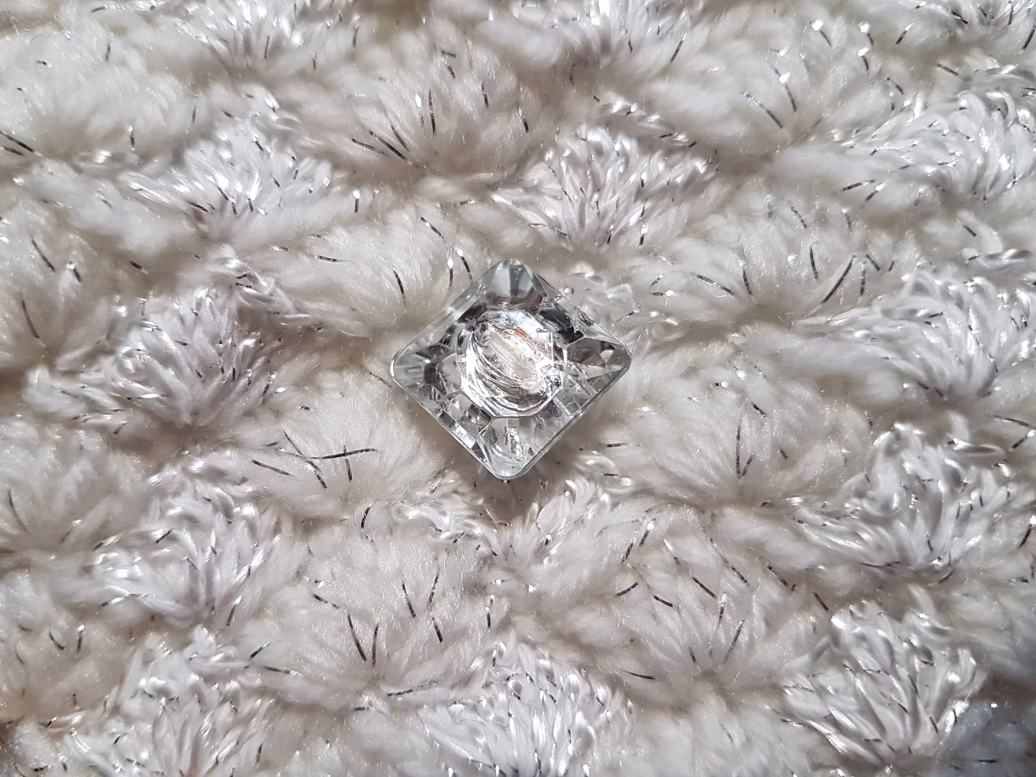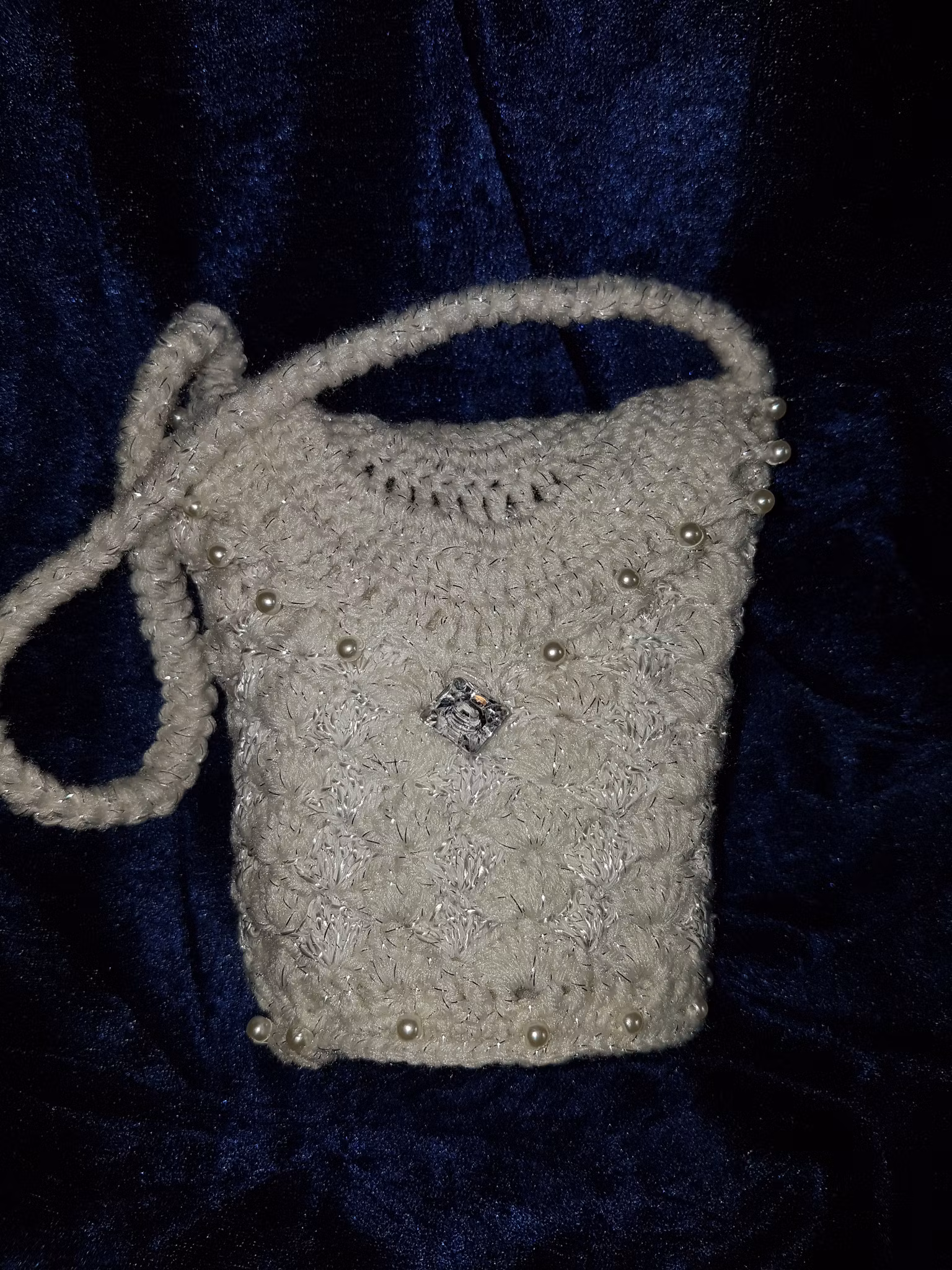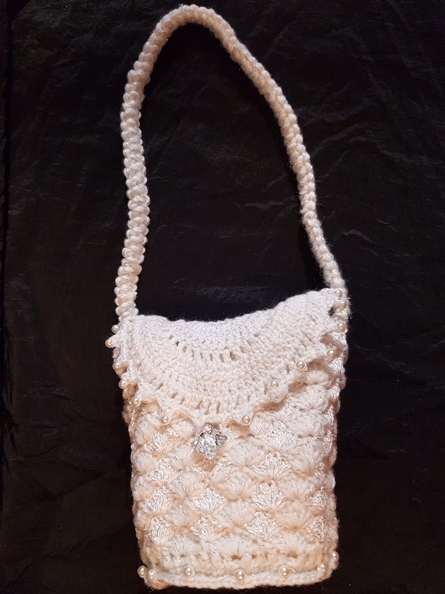 handvirkad av två effektgarn med olika struktur och glans. fodrad med vit satin. Kantad med 28 vita pärlor.