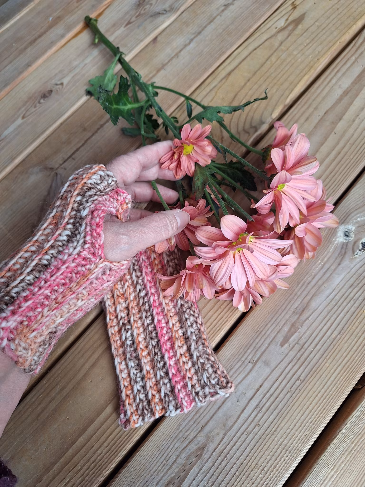Handledsvärmare / Pulsvärmare, hemstickade i supermjukt härligt ekologiskt färgat ullgarn, med tumhål, storlek 15 x 8 cm otöjda, kan töjas (resårstickade), handtvätt