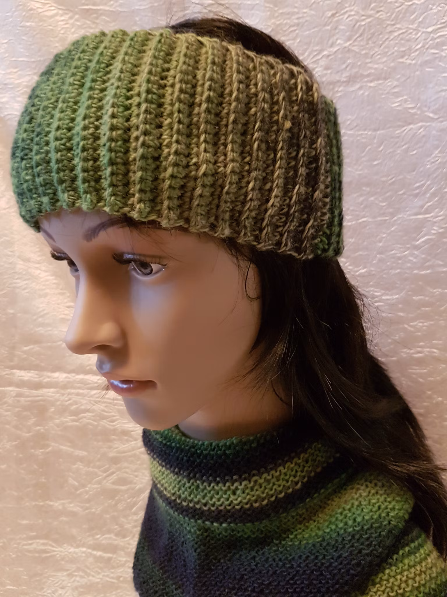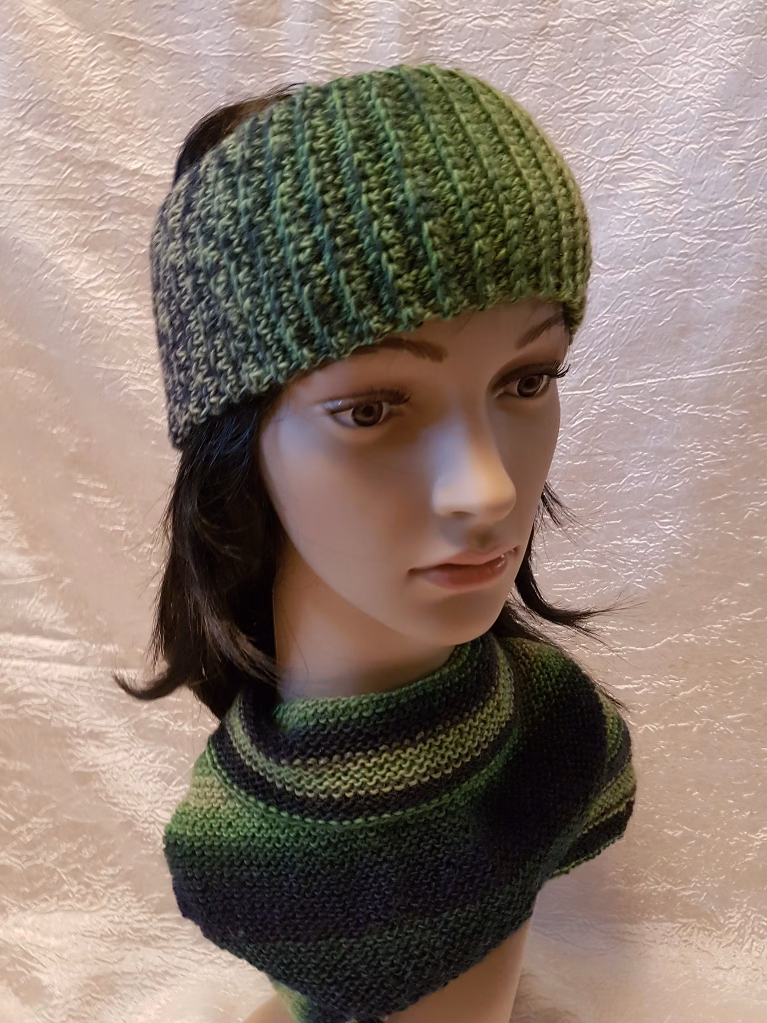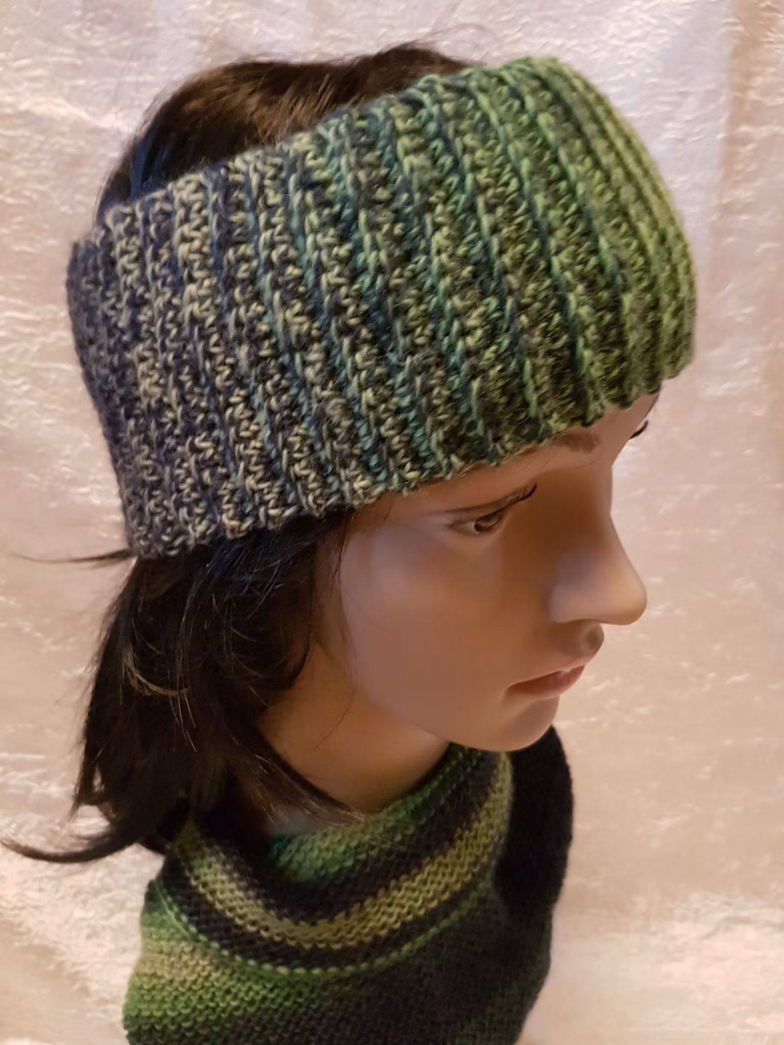 Detta är ett matchande sjal och pannband-set i mycket mjukt och följsamt garn. Setet finns även som ett garn-kit i olika färger med garn och mönster om man vill sticka/virka själv. 75% ull 25% nylon