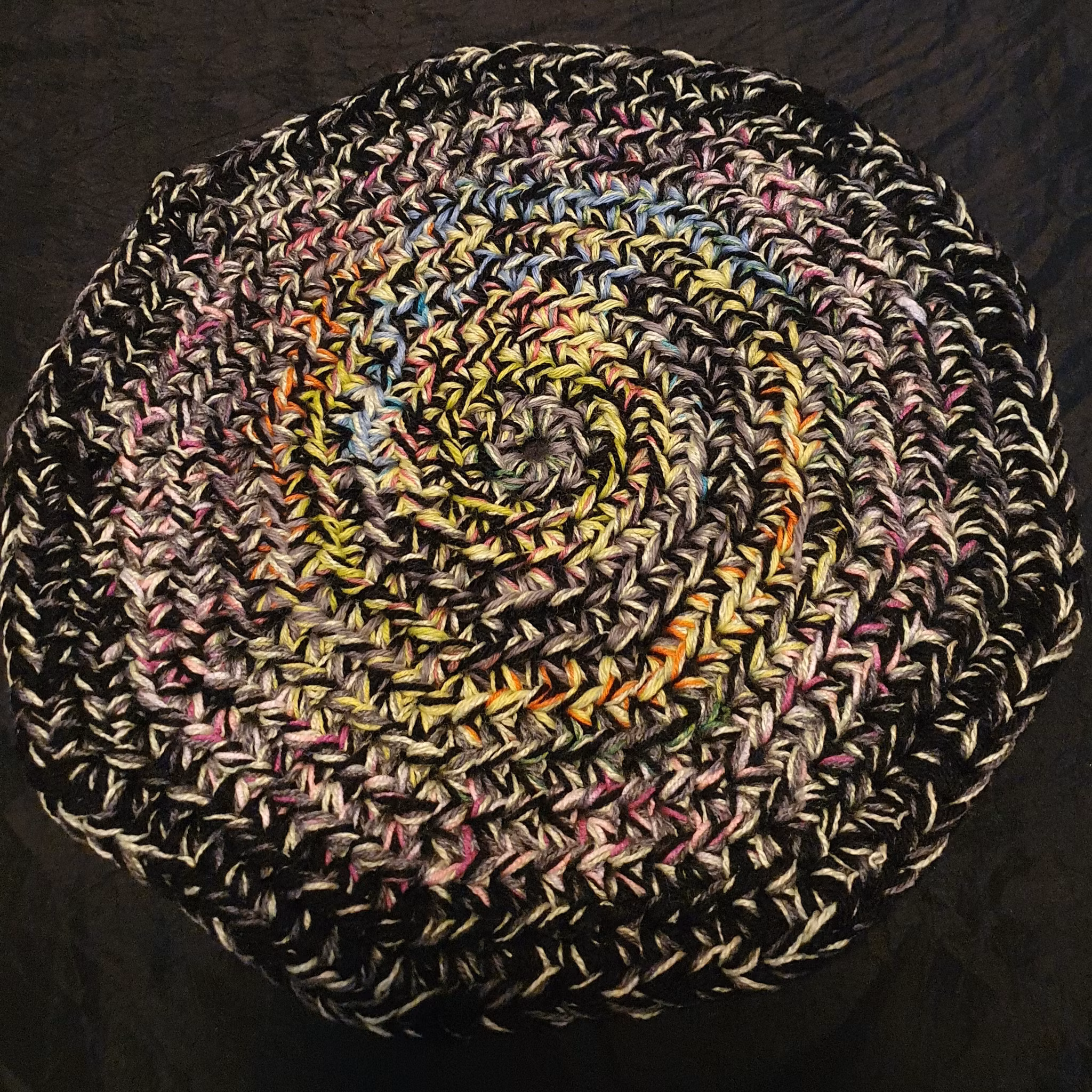 Unikt varmt och gosigt sittunderlag virkat av blandade garnrester. Återvinning, miljötänkande och en härlig produkt!