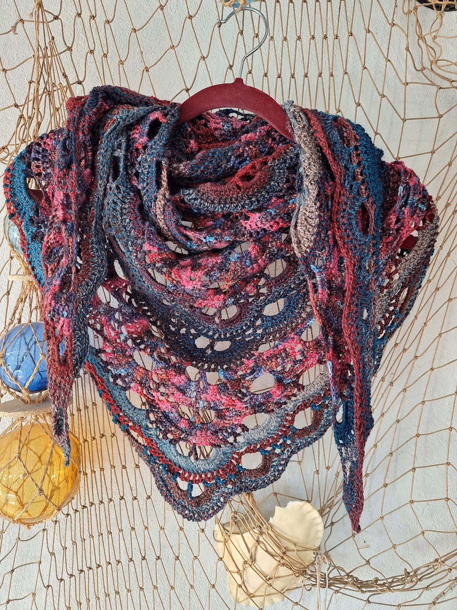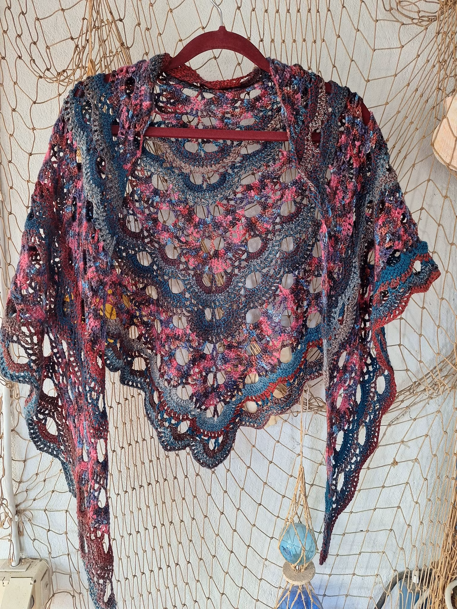 Denna sjal är virkad i det lyxiga handfärgade kvalitetsgarnet Alegria och Zauberball Crazy. Kombinationen av 75% ull och 25% polyamid ger en perfekt balans mellan värme och hållbarhet. Denna sammansättning säkerställer att sjalen behåller sin form och skönhet under lång tid, samtidigt som den är mjuk och behaglig mot huden.